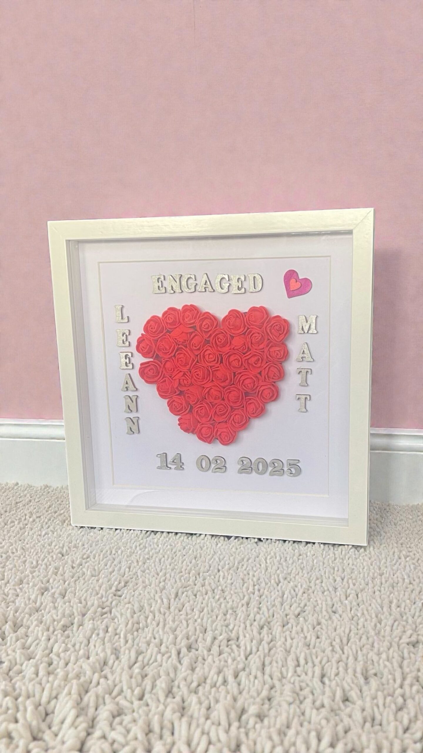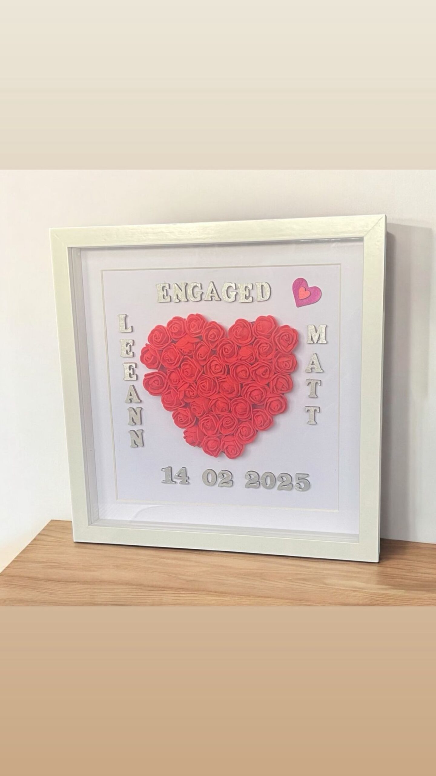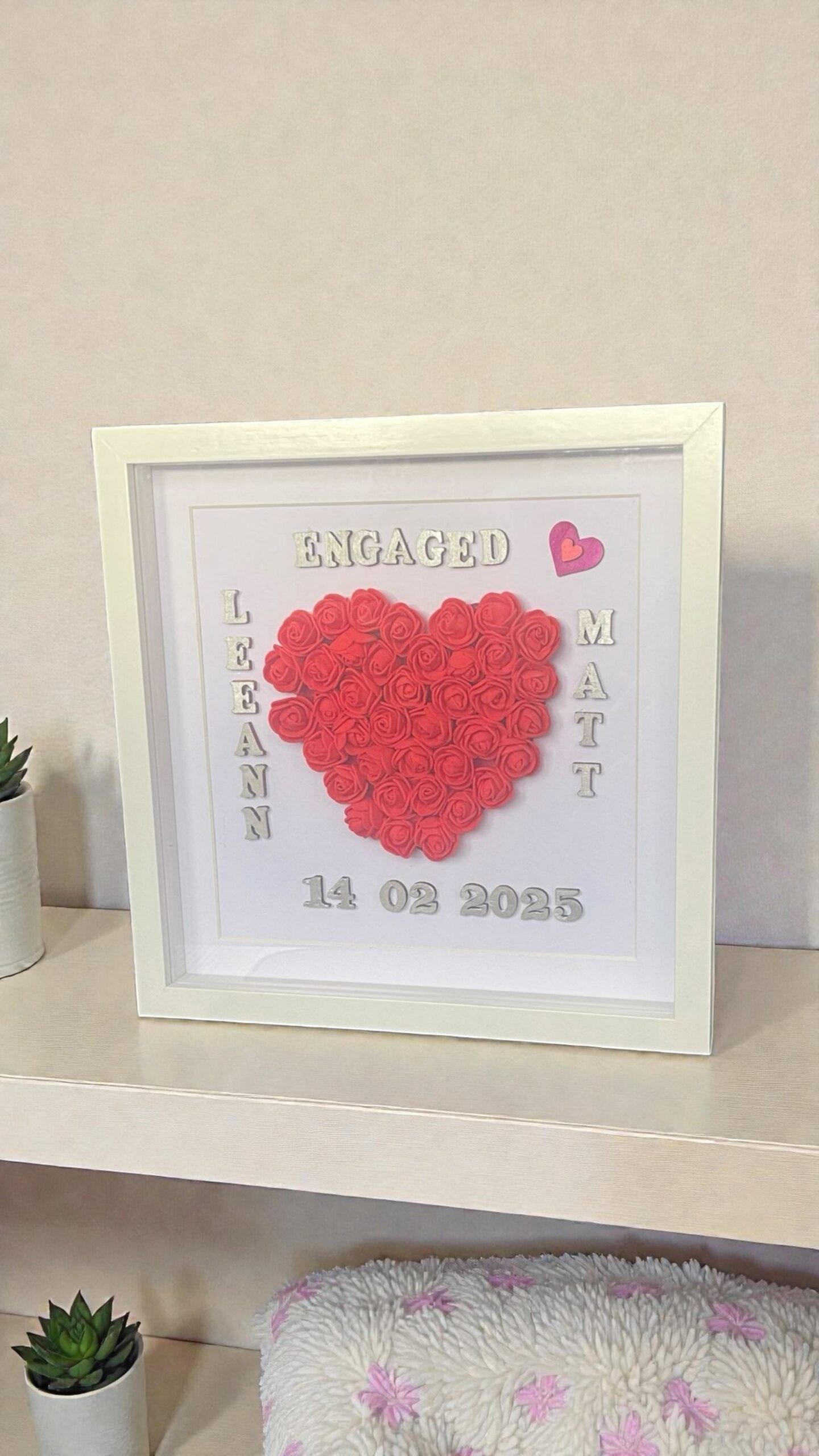 Celebrate the magic of your engagement with our Personalised Engagement Frame, a timeless keepsake designed to cherish your love story. Handcrafted with a delicate 3D heart of foam roses, each frame can be customised with names, engagement date, and colours to reflect your unique style. The elegant shadow box frame transforms any photograph into a heartfelt display, perfect for gifting or keeping as a treasured memory. Thoughtfully designed with quality materials and attention to detail, this frame is a romantic reminder of your unforgettable “Yes!”—a piece to admire and cherish for years to come.