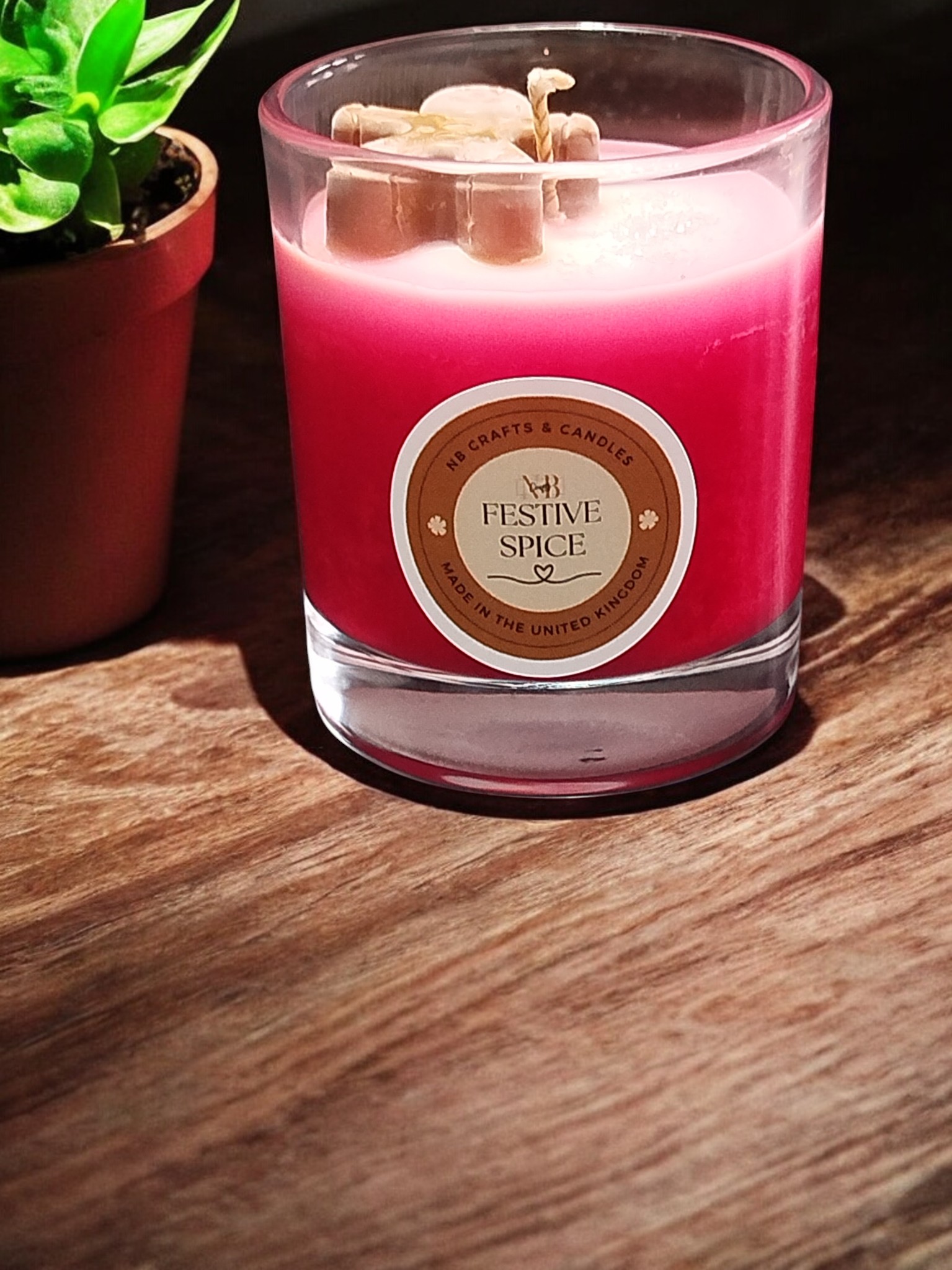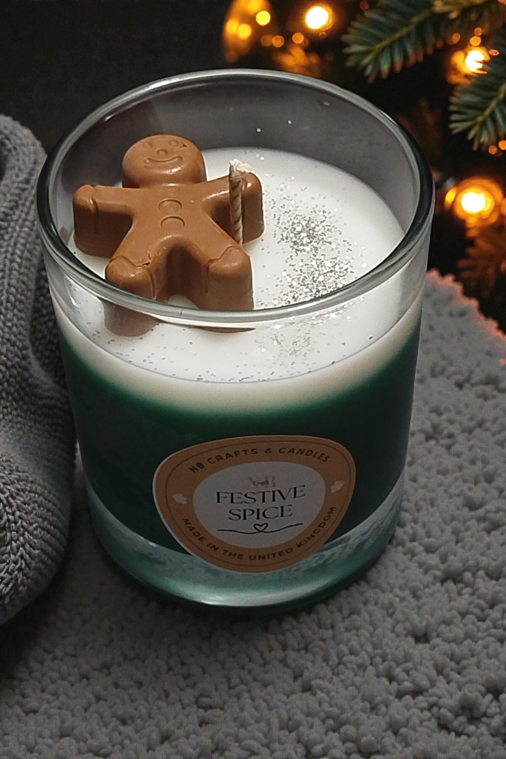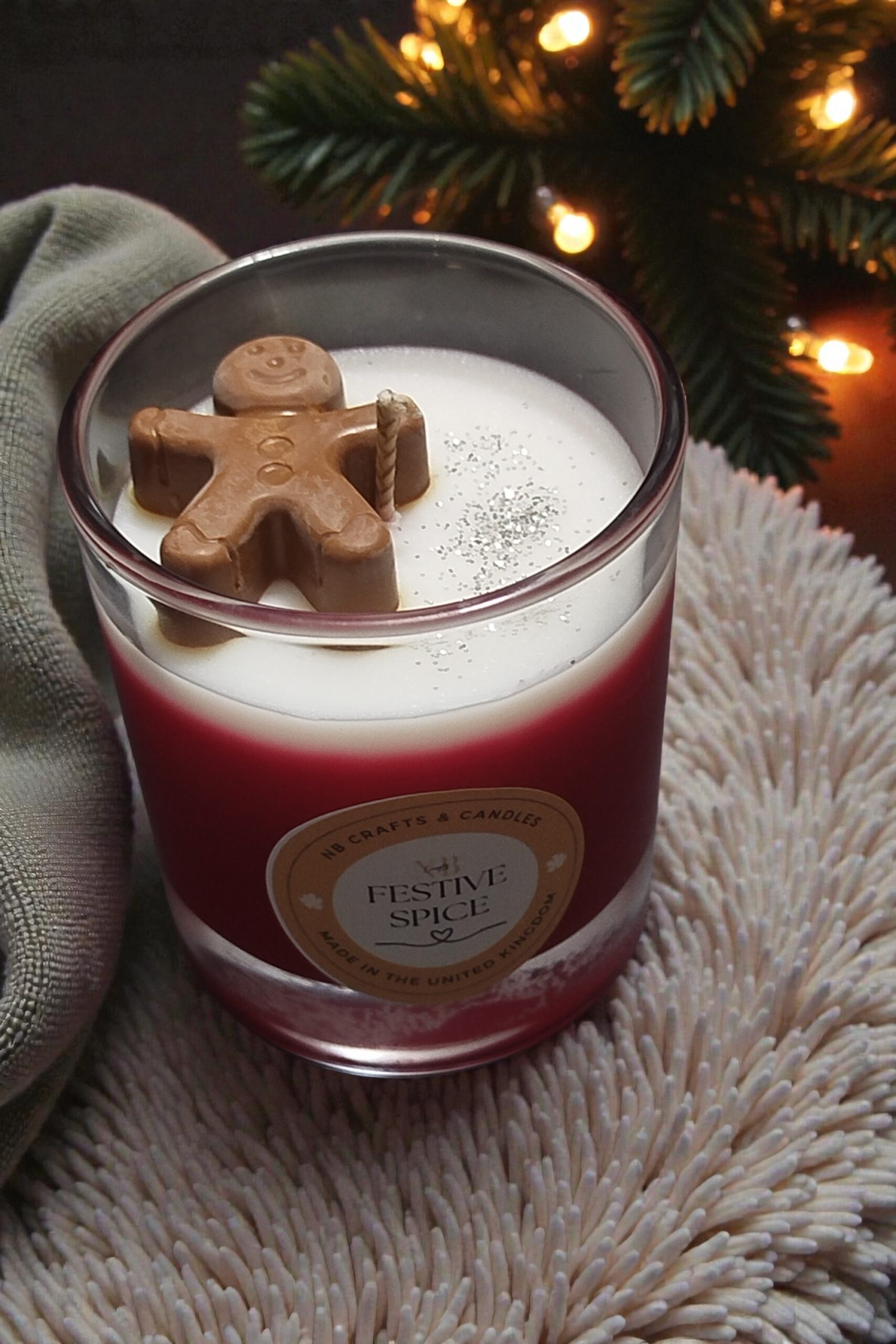 Festive Spice is a handcrafted Christmas candle created to elevate the winter season. Hand-poured in the UK using a premium coconut and rapeseed wax blend, it delivers a clean, long-lasting burn with an elegant gingerbread-inspired fragrance of warming spices, dried fruits, and soft vanilla. Finished with a delicate gingerbread wax detail and subtle festive shimmer, it is a beautifully considered piece for refined Christmas interiors and luxury seasonal gifting.