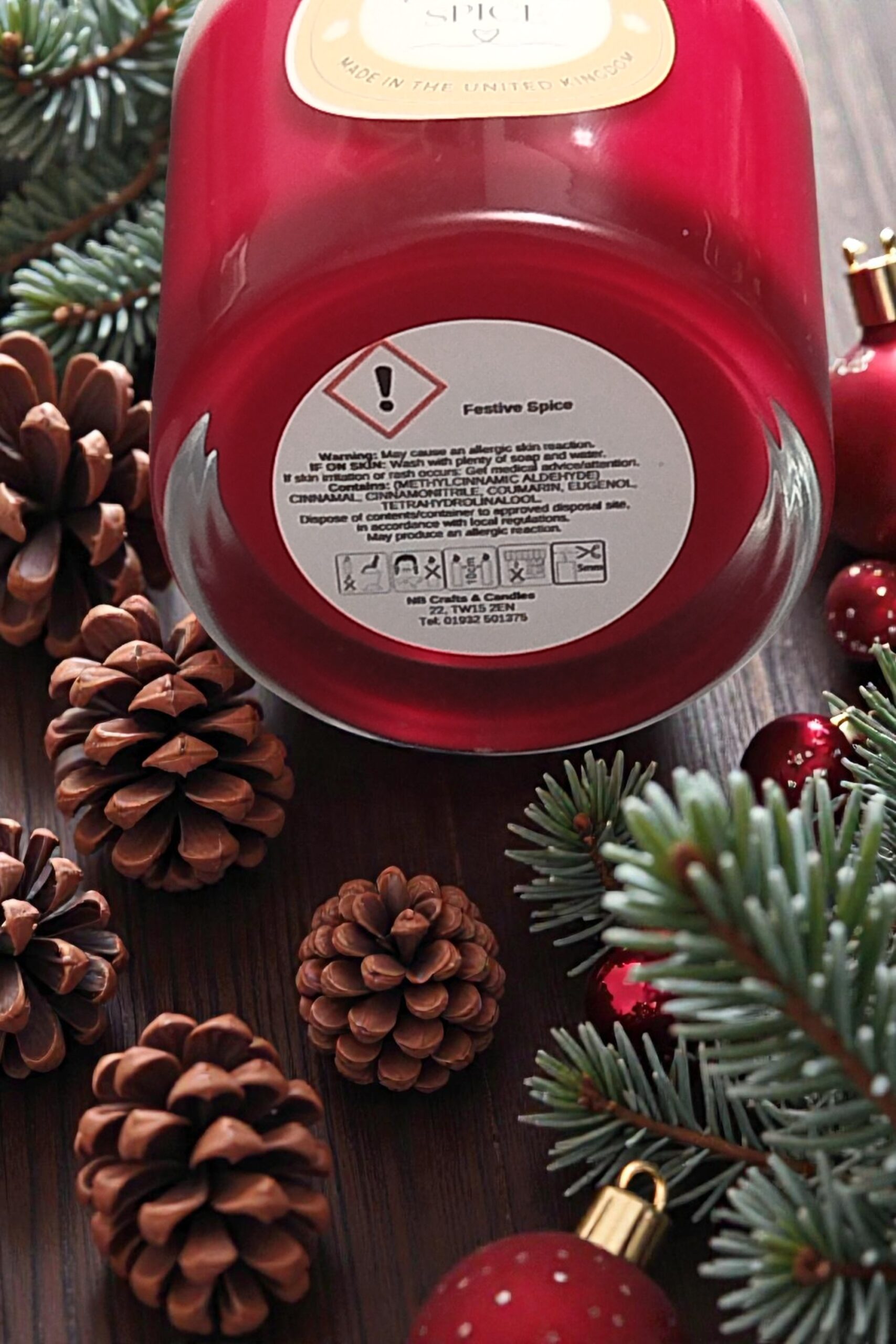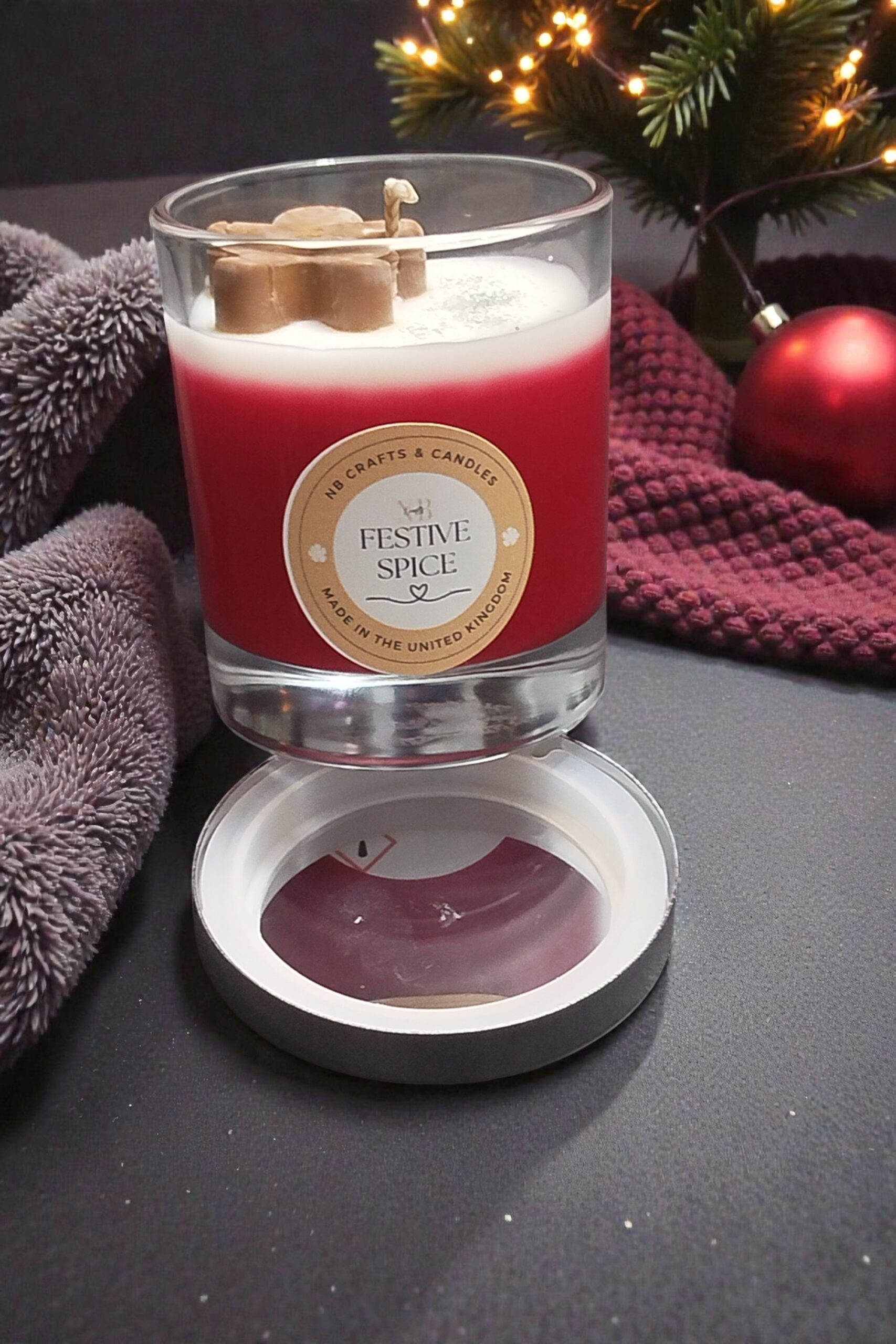 Festive Spice Christmas Candle with gingerbread scent in a clear glass jar