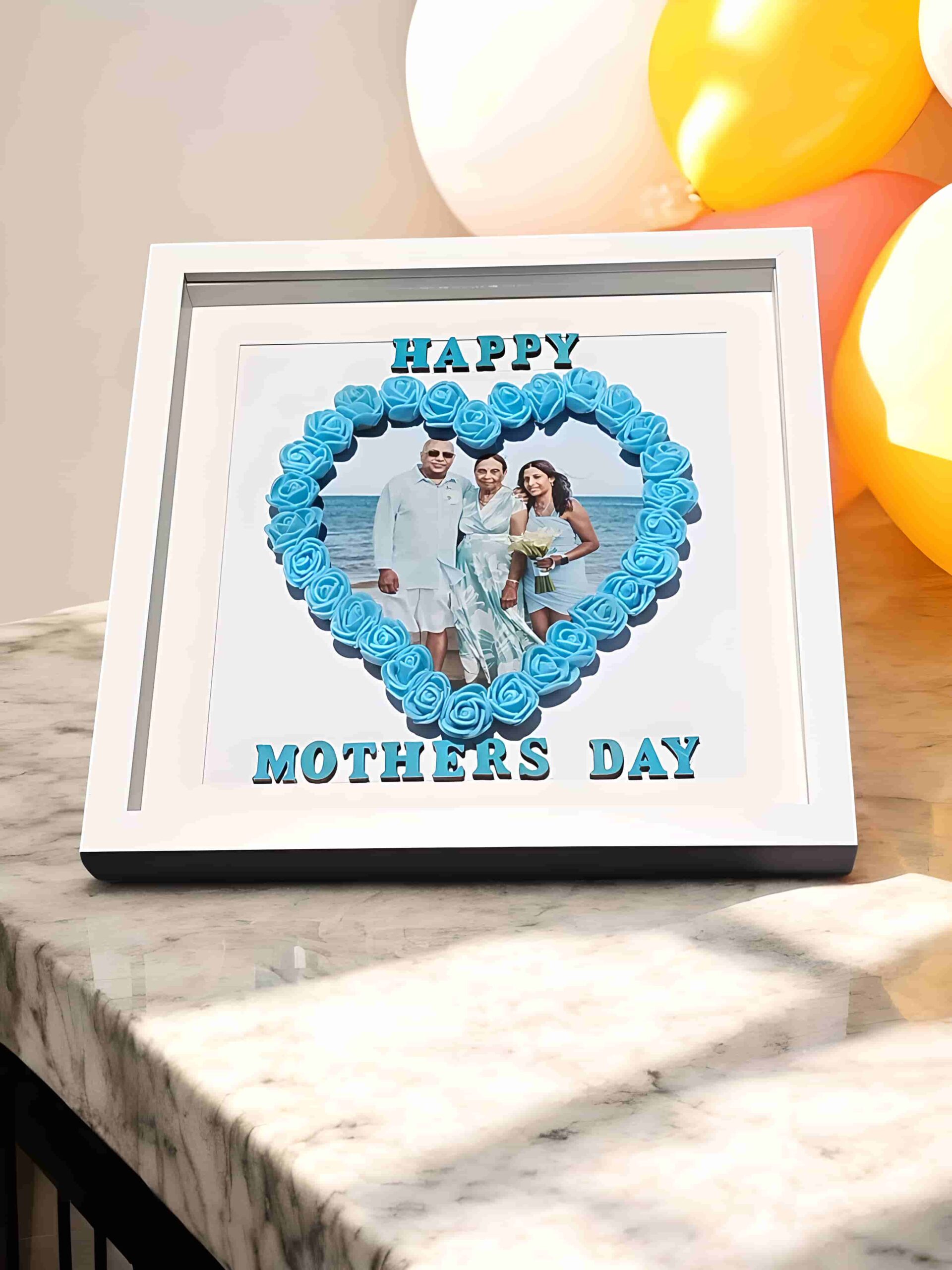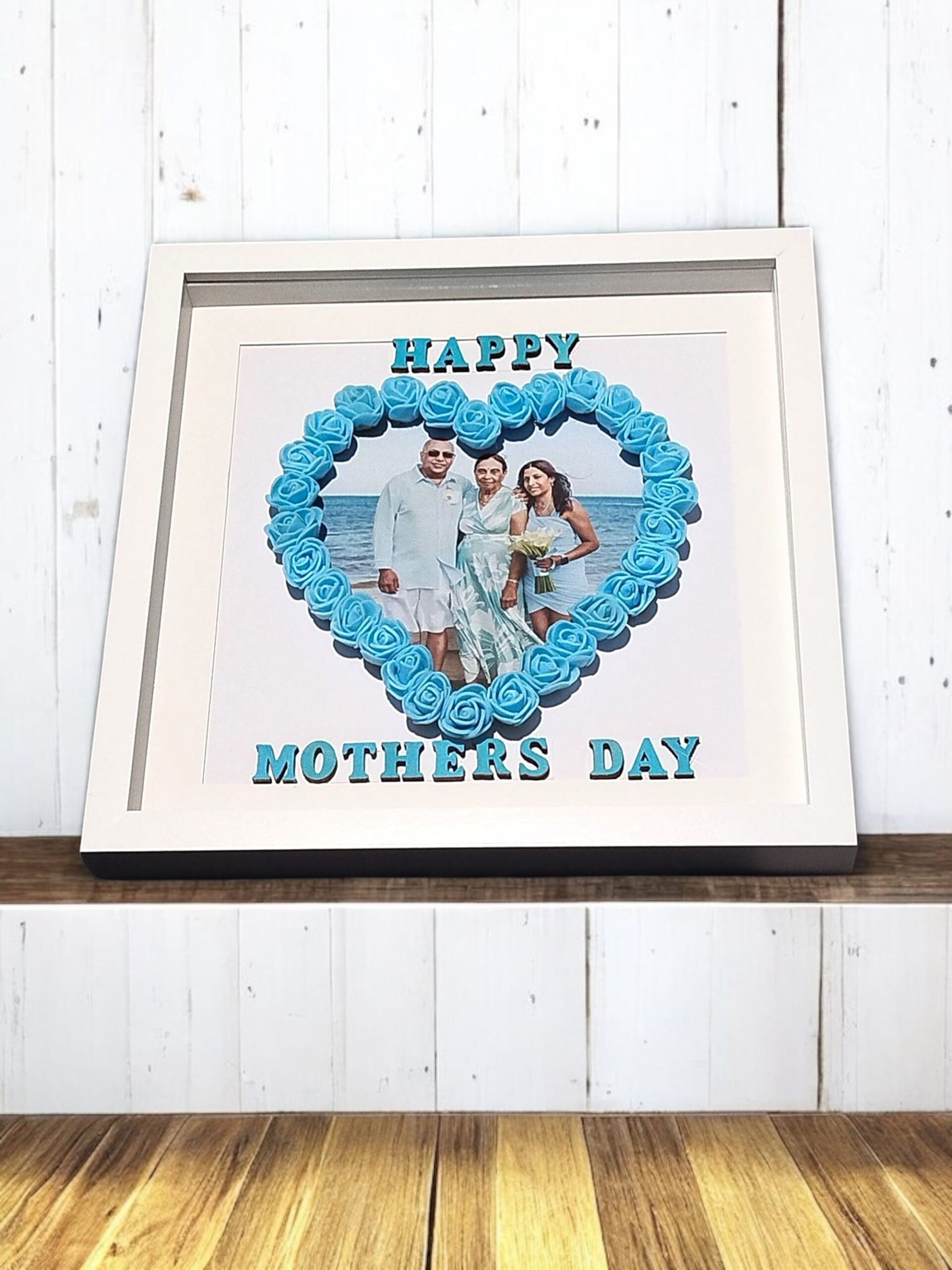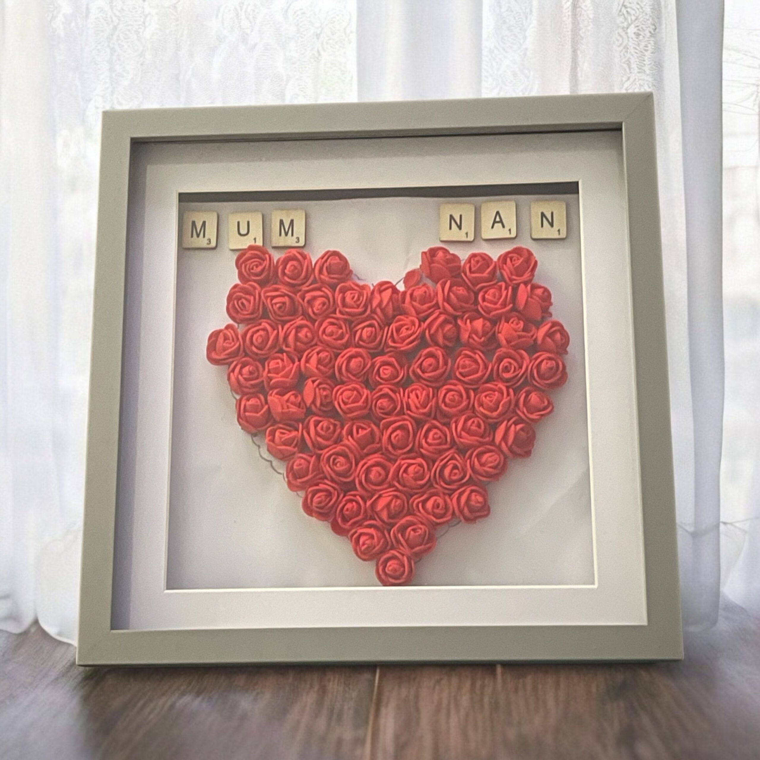 Celebrate love and cherished memories with this Floral Heart Keepsake Frame. Handcrafted with 3D foam roses arranged in a heart shape, it beautifully showcases your chosen photograph, creating a personal and timeless keepsake. Customise the lettering and rose colours to perfectly reflect your style or the recipient’s favourite shades. Set within a premium white shadow box, this frame adds elegance and warmth to any room. Perfect for Mother’s Day, Father’s Day, birthdays, anniversaries, or as a heartfelt gift, the Floral Heart Keepsake Frame transforms treasured moments into a lasting display of love, gratitude, and nostalgia.